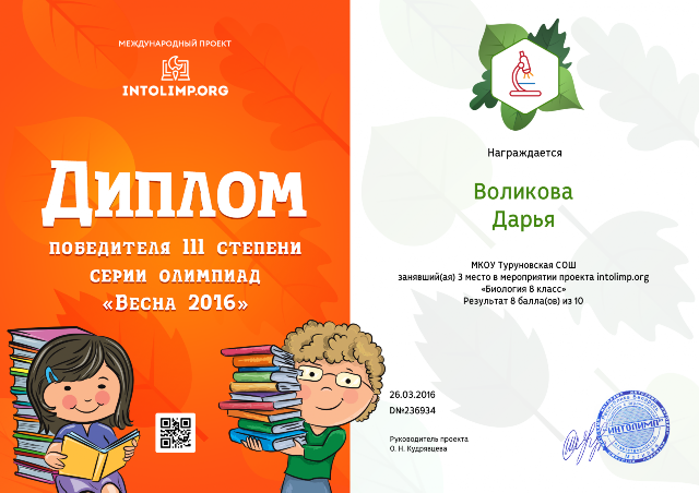 Воликова Дарья, ученица 8 класса. Диплом 3 степени в серии олимпиад "Весна 2016" | |
